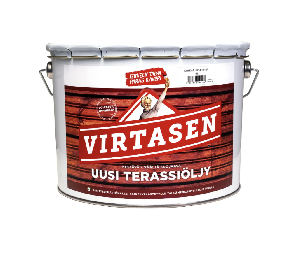 Virtasen Uusi Terassiöljy perustuu tarkoin valittuihin luonnonöljyihin sekä tehokkaaseen UV-suojaan. Taidokkaasti yhdistettynä ne antavat terassillesi useamman vuoden suojauksen auringon ja veden vaikutuksia vastaan. Virtasen terassiöljy sopii erinomaisesti kaikille puuterasseille olivatpa ne uusia taikka aiemmin puunsuoja-aineilla käsiteltyjä.